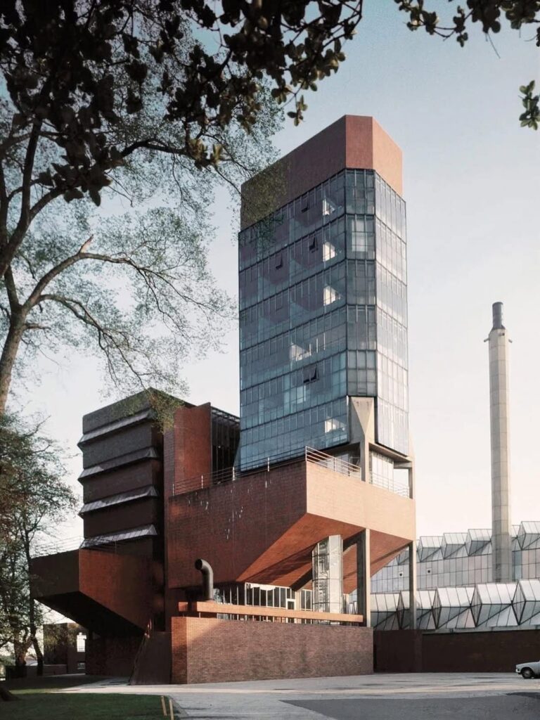 Leicester Engineering Building جيمس ستيرلنغ، 1963 . كتلة خرسانية تعبّر عن صرامة صناعية، ملطّفة بكسوة طوبية وزجاجية.