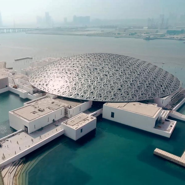 متحف اللوفر أبوظبي — كتلة مغطّاة بقبة فولاذية مثقّبة تحوّل الضوء إلى عنصر معماري، وتؤسس حواراً مع البحر والفضاء الثقافي المحيط.